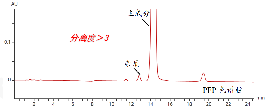 當(dāng)我們把乙腈更換為甲醇后,甲醇的羥基與PFP固定相的氟原子形成互補(bǔ)作用,可增強(qiáng)對位置異構(gòu)體的區(qū)分。結(jié)果主成分與雜質(zhì)的分離度達(dá)到了3以上,遠(yuǎn)遠(yuǎn)滿足了檢測需求。